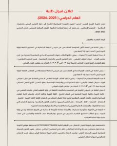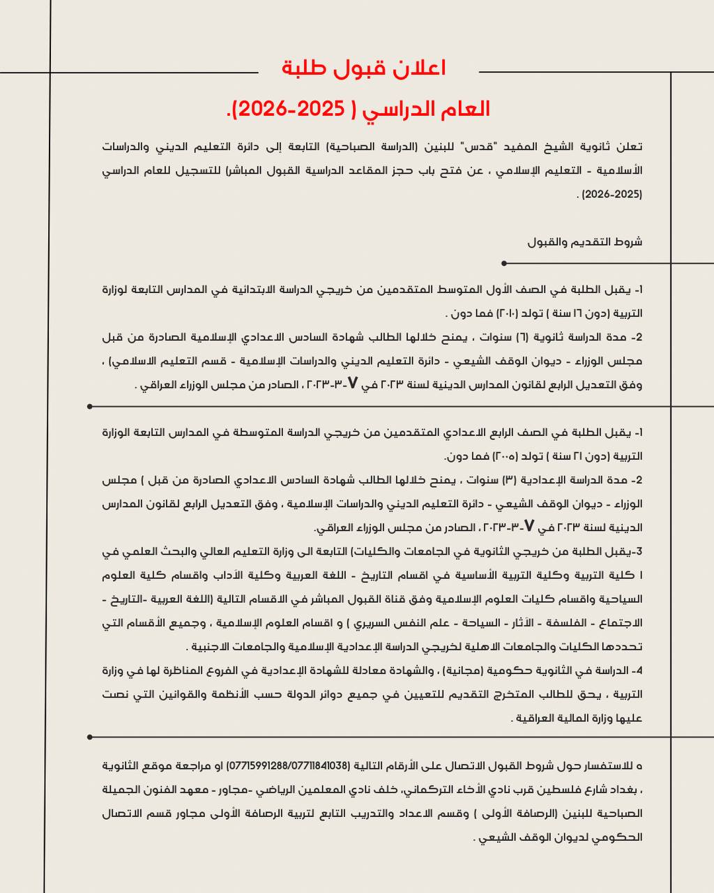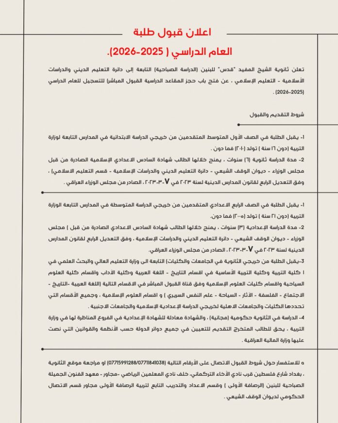 تعلن ثانوية الشيخ المفيد “قدس” للبنين (الدراسة الصباحية) التابعة لدائرة التعليم الديني والدراسات الإسلامية في ديوان الوقف الشيعي – التعليم الإسلامي، عن فتح باب حجز المقاعد الدراسية القبول المباشر) للتسجيل للعام الدراسي (2025-2026) .