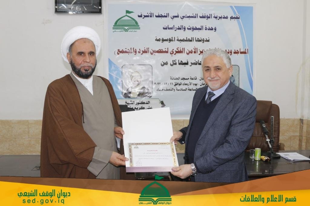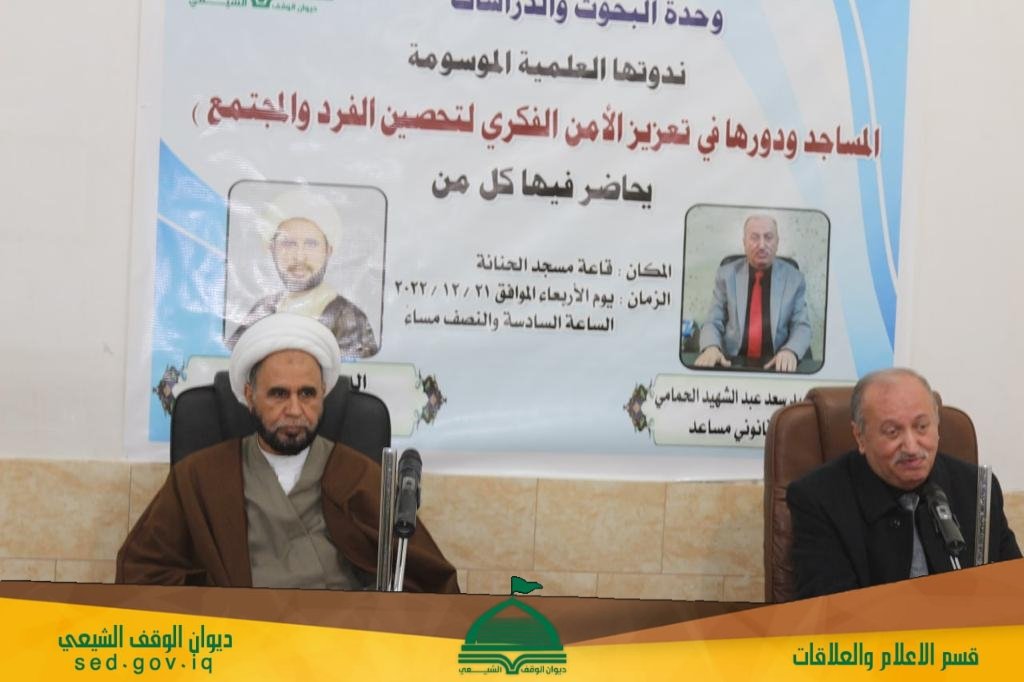 اقامت وحدة البحوث والدراسات في مديرية الوقف الشيعي في النجف الاشرف ندوة حوارية فكرية بعنوان( المساجد ودورها في تعزيز الامن الفكري لتحصين الفرد والمجتمع) على قاعة مسجد الحنانة المعظم بحضور مدير الوقف الشيعي في النجف الاشرف السيد حيدر العذاري وعدد من منتسبي المديرية