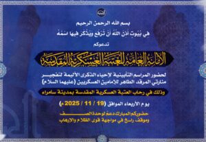 من جانبه وجه الكتبي الموظفين في تشكيلات الديوان بالمشاركة في إحياء هذه المناسبة الأليمة على قلوب شيعة اهل البيت (عليهم السلام) والتي تقام في رحاب الأمانة العامة للعتبة العسكرية المقدسة في سامراء يوم الأربعاء بتاريخ ( ١١/١٩/٢٠٢٥) بحضور رسمي و شعبي.