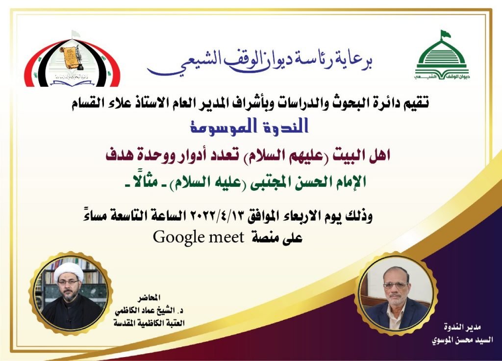برعاية رئيس ديوان الوقف الشيعي الدكتور حيدر الشمري وباشراف مدير عام دائرة البحوث والدراسات الاستاذ علاءالقسام اقامت دائرة البحوث والدراسات في ديوان الوقف الشيعي ندوة الكترونية فكرية تحت عنوان أهل البيت “عليهم السلام” تعدد أدوار ووحدة هدف الحسن المجتبى “عليه السلام” مثالًا