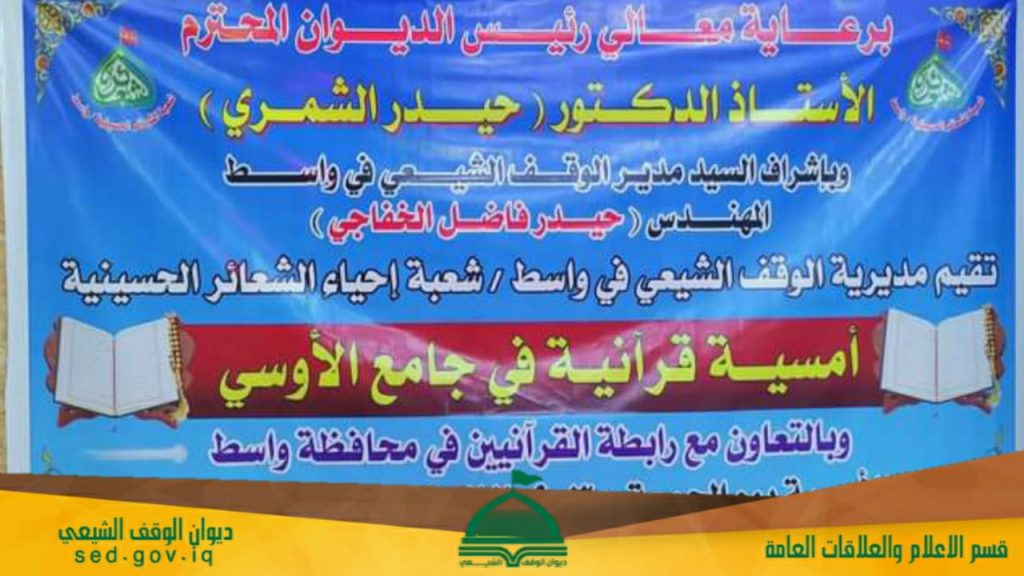 برعاية السيد رئيس ديوان الوقف الشيعي الدكتور حيدر الشمري وبأشراف مدير الوقف الشيعي  في واسط المهندس حيدر فاضل الخفاجي اقامت مديرية اوقاف واسط شعبة إحياء الشعائر ، بالتعاون مع رابطة  القرآنيين في المحافظة، امسية قرآنية في جامع وحسينية الأوس  في مدينة الكوت .